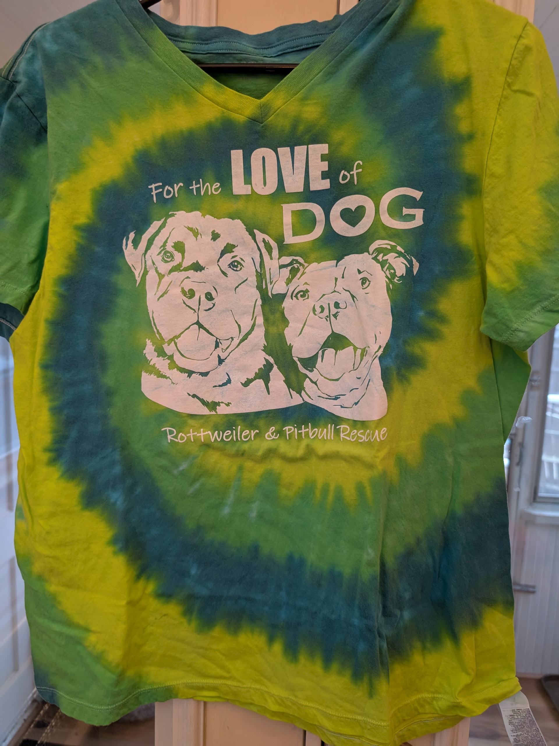 A Dye Girls Original – Hand dyed in New Hampshire, this Lime, Green & Blue colored V neck shirt will WOW your friends. Emblazoned with the Cash-Kahn design is as unique as its wearer!~ Size X- Large. Short Sleeve $35 shipped