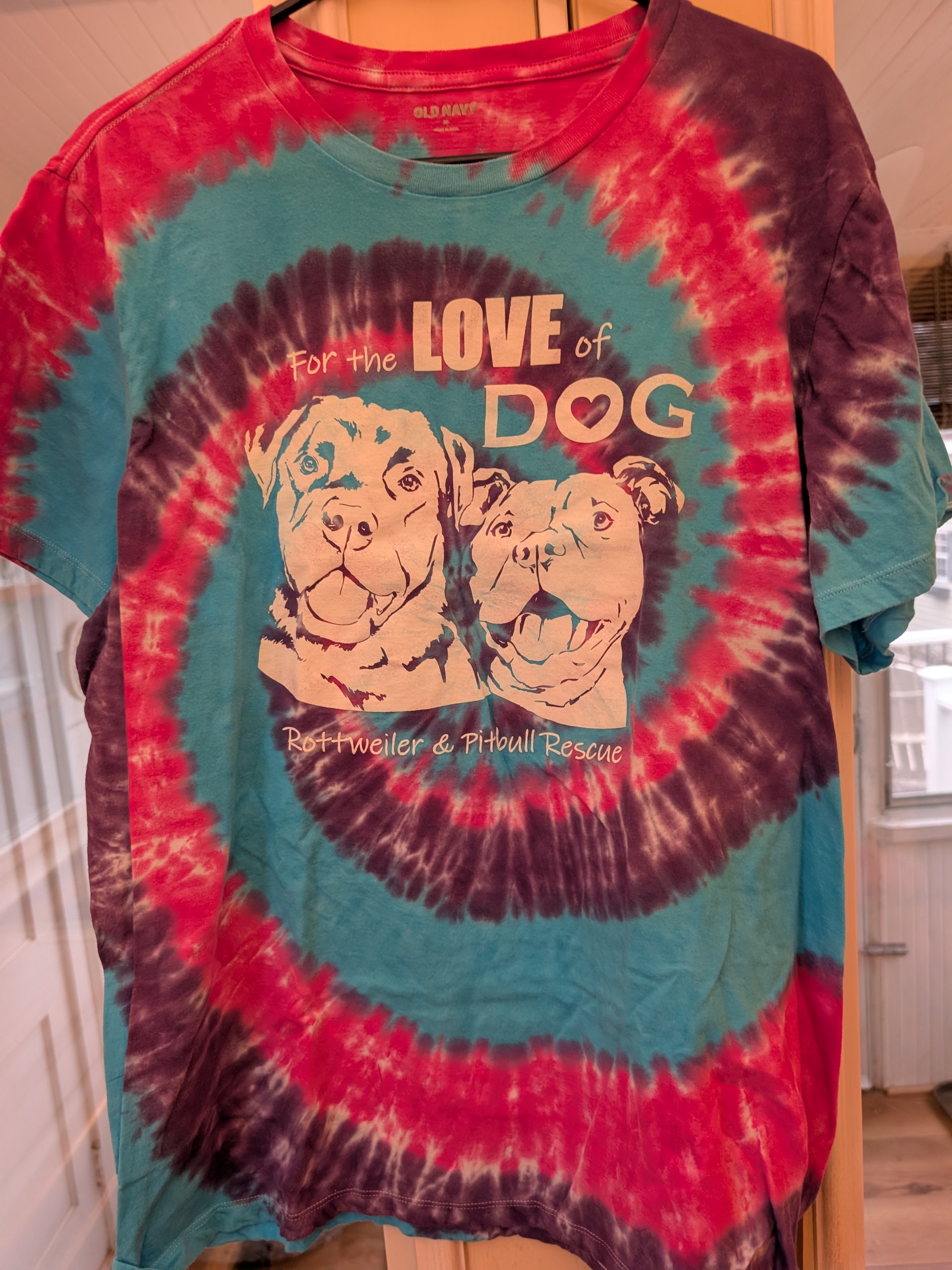 A Dye Girls Original – Hand dyed in New Hampshire, this Teal, Hot Pink & Purple scoop neck shirt will WOW your friends. Emblazoned with the Cash-Kahn design is as unique as its wearer!~ Size Large. Short sleeve. $35 shipped
