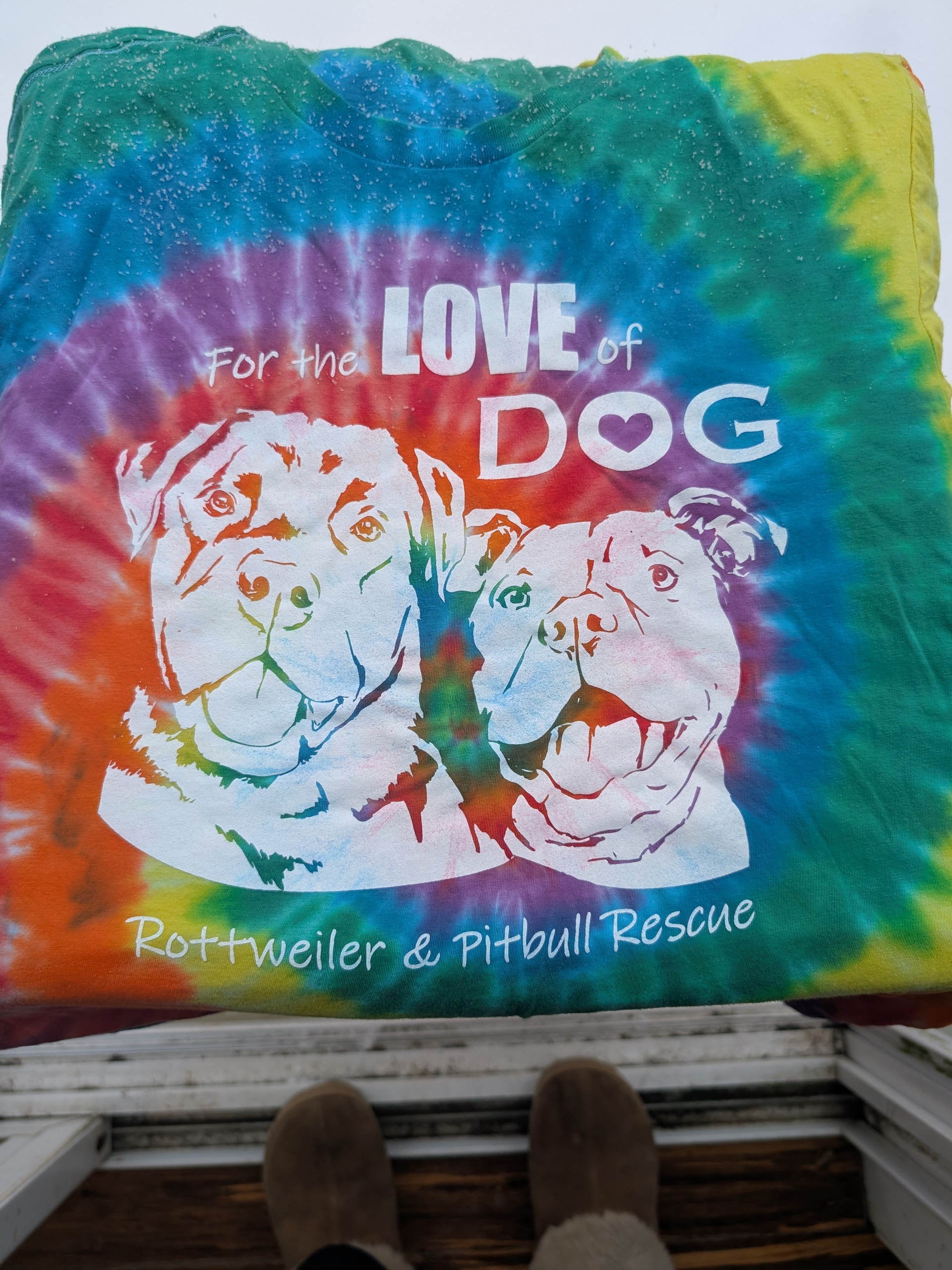 A Dye Girls Original – Hand dyed in New Hampshire, this Rainbow colored scoop neck shirt will WOW your friends. Emblazoned with the Cash-Kahn design is as unique as its wearer!~ Size Large. Short Sleeve $35 shipped