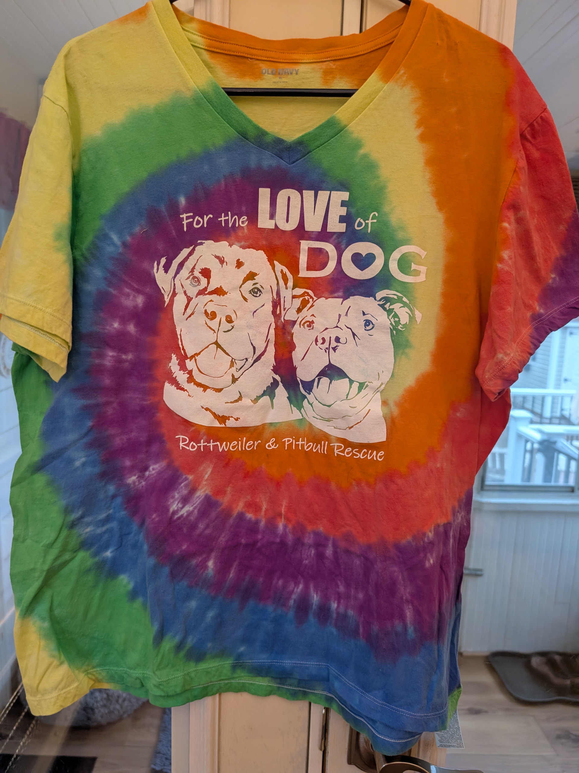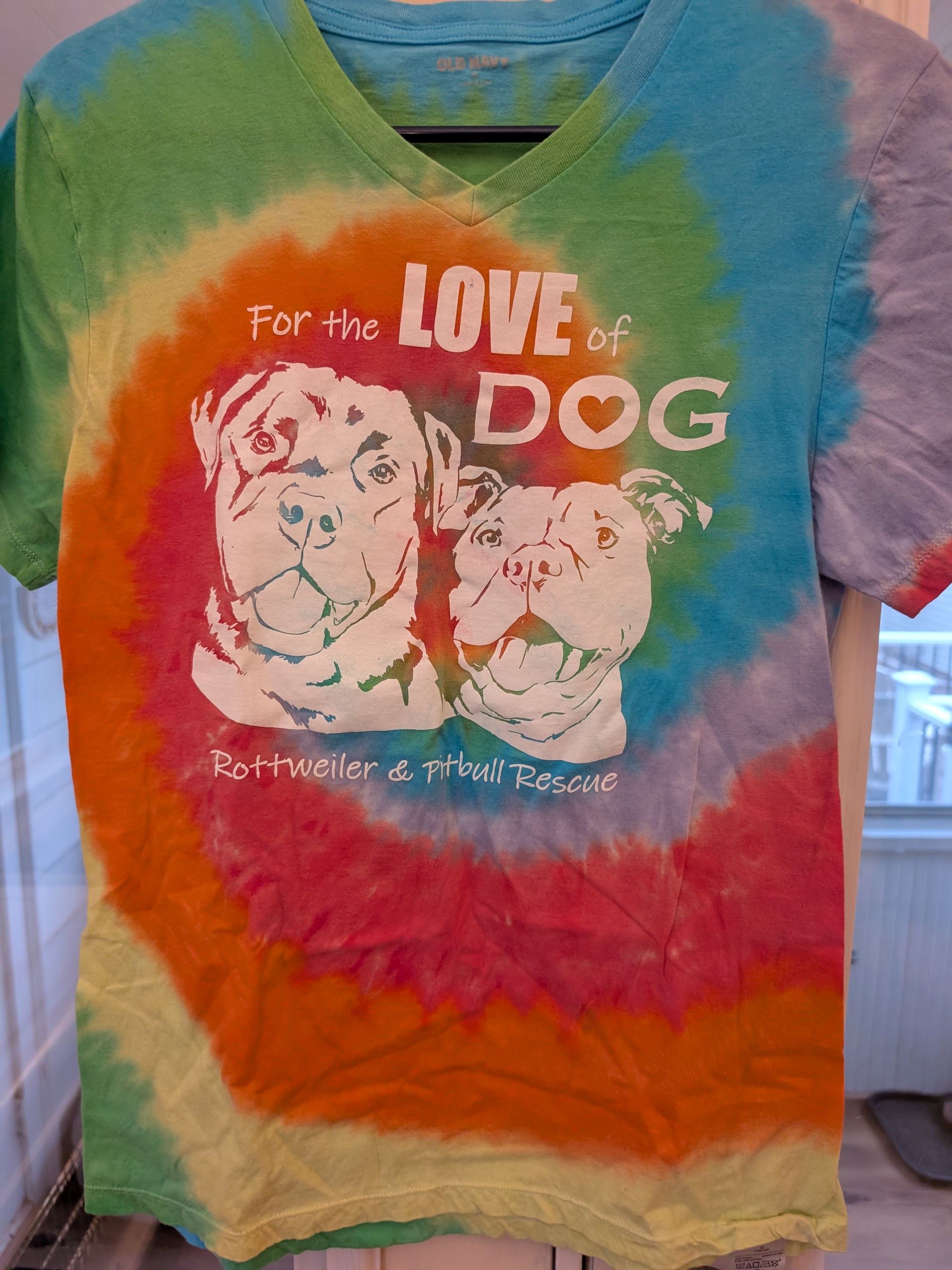 A Dye Girls Original – Hand dyed in New Hampshire, this Rainbow colored V neck shirt will WOW your friends. Emblazoned with the Cash-Kahn design is as unique as its wearer!~ Size X- Large. Short sleeve. $35 shipped